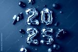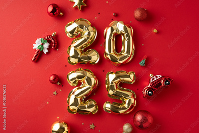 Golden balloons forming 2025 surrounded by red Christmas ornaments on a vibrant red background, symbolizing celebration and festive cheer for the New Year