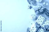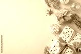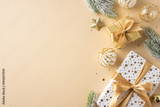 Beautifully wrapped Christmas gifts with gold ribbons and holiday decorations. Festive scene featuring luxury presents, pine branches, and star ornaments on a gold background