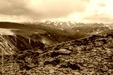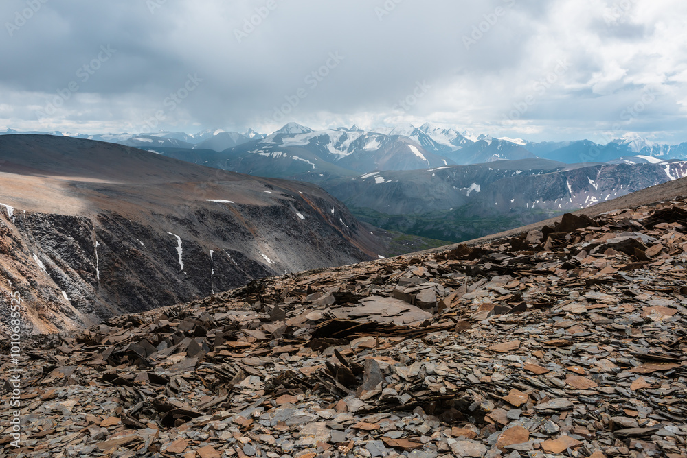 Dramatic top view from stone pass above alpine valley to large mountain range with snow-capped peaks on horizon in gray cloudy sky. Sunlit rocky steep slope and snowy tops far away under rainy clouds.