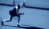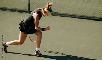 Sporty blonde woman celebrating with a fist pump on an outdoor tennis court