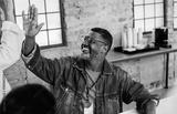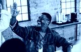 Smiling African-American man gives a joyful high five at work in a casual office setting with exposed brick walls.