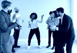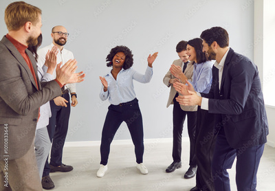Group of happy excited business young people men and women having fun in office happy to make a good deal. Company employees celebrating success congratulating female colleague indoors.