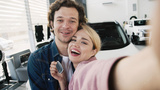 A happy married couple takes a selfie on their phone in front of a new purchased car. The concept of positive emotions and a long-awaited purchase.