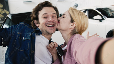 A young family is happy about buying a brand new car at a modern car dealership. A married couple takes a photo near their new car.