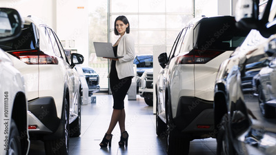 In a modern car showroom, a female consultant reviews data on her laptop, surrounded by stylish vehicles. Her expertise ensures clients receive the best advice for their automotive needs.