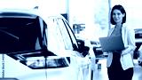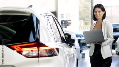 A confident female dealer is near sleek, modern cars in the showroom, analyzing data and taking notes on her laptop. Her focused approach ensures clients receive tailored advice for their ideal vehicl