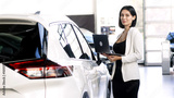 In a modern car showroom, a female consultant reviews data on her laptop, surrounded by stylish vehicles. Her expertise ensures clients receive the best advice for their automotive needs.