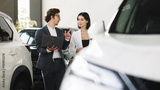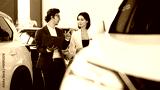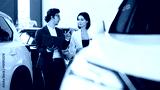 A professional salesman consults a buyer using a laptop in a stylish car showroom, demonstrating the main characteristics of cars.