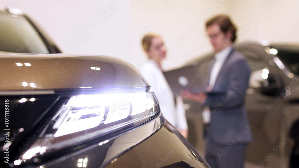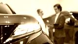 A confident car dealer discusses discounts and benefits of a new car with the buyer. This exchange highlights the excitement of buying and test-driving a new car.