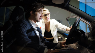 A manager communicates with a buyer in a modern car showroom. Concept of buying a new car.