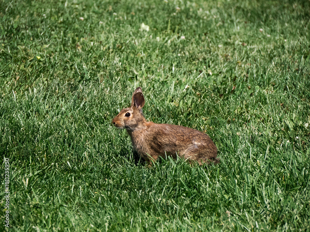 A bunny Eastern Cottontail Rabbit in long island green grass