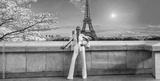 A beautiful fashion model with elegant white suit stands in front of Eiffel tower in Paris. Gorgeous and elegant woman with perfect shape. Paris Fashion.