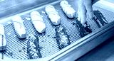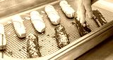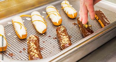 Pastry eclairs decorated with black and white chocolate and orange rind