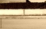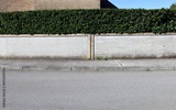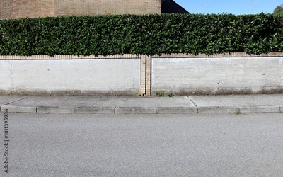 House fence made of prefab concrete wall bordered by a row of bricks and hedge on top . Brick wall and sky on behind. Cement sidewalk and street in front. Background for copy space..