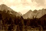 A panoramic view of a majestic mountain range, with towering peaks and rugged cliffs, overlooking a dense forest of evergreen trees under a clear blue sky.