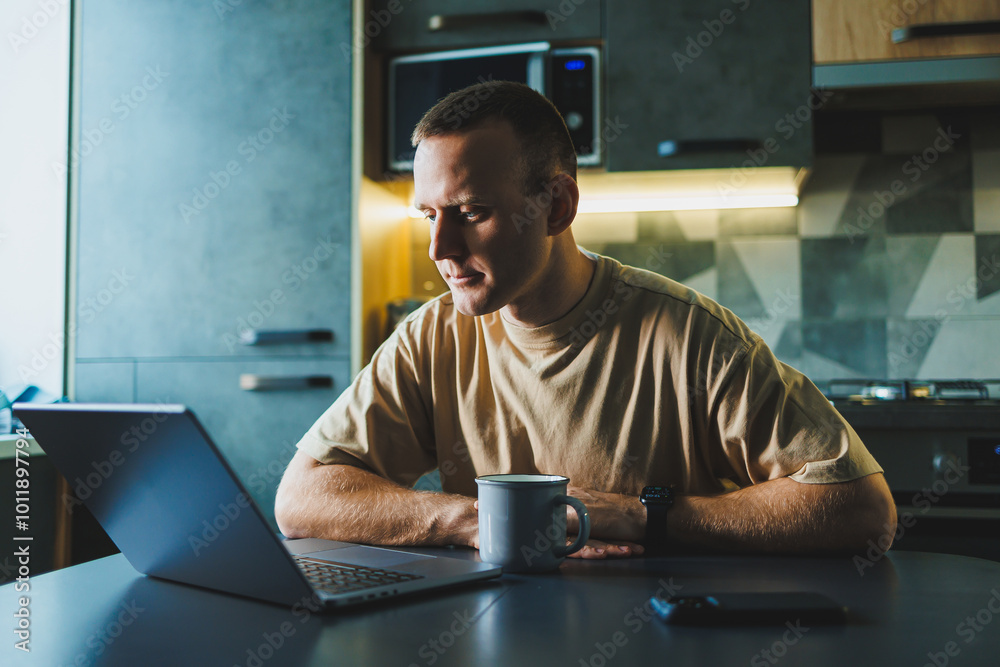 A man sits at home at the kitchen table and works on a laptop, a man drinks coffee while sitting at home using a computer