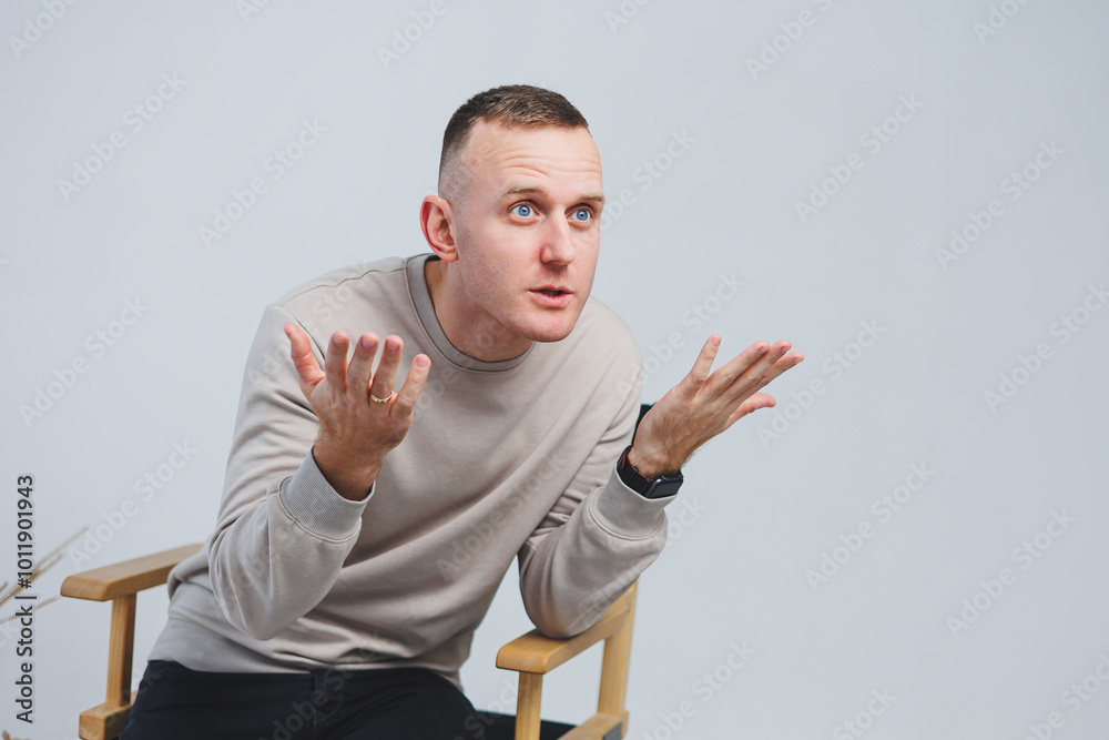 A young man sits on a chair and shows his emotions to the camera.
