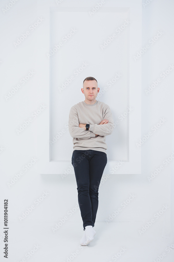 A man on a white background is dressed in raglan and black pants. Men's casual wear.