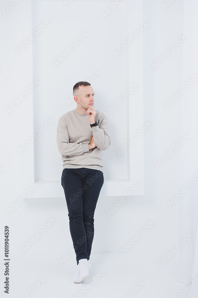 A man on a white background is dressed in raglan and black pants. Men's casual wear.