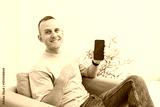 A handsome man sits in a chair and works on the phone. A man is talking on the phone while sitting at home.