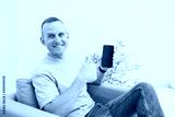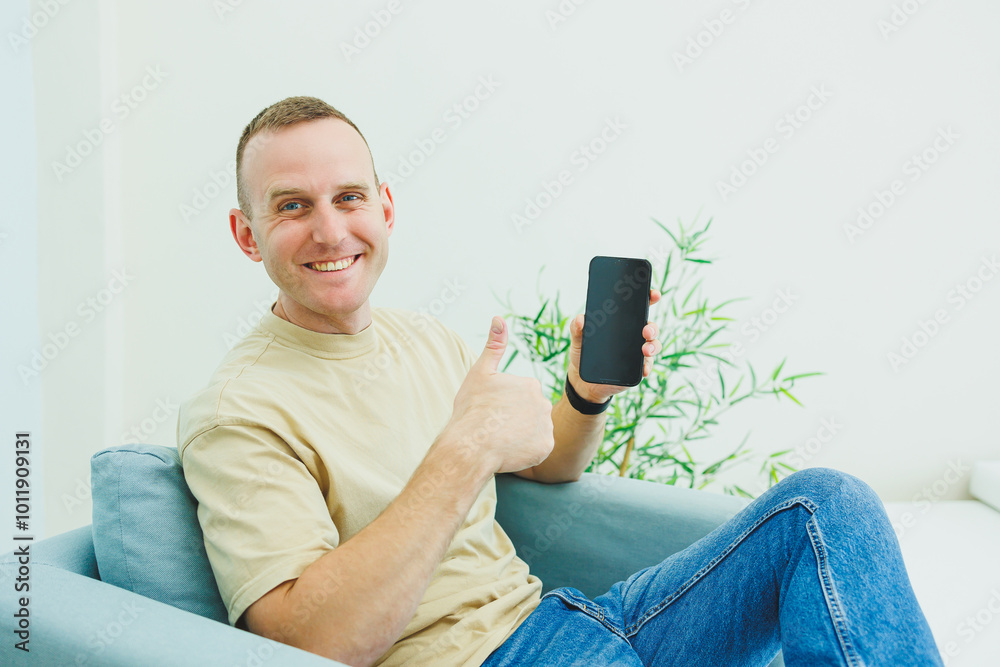 A handsome man sits in a chair and works on the phone. A man is talking on the phone while sitting at home.