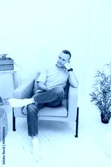 A handsome man sits in a chair and works on the phone. A man is talking on the phone while sitting at home.