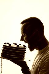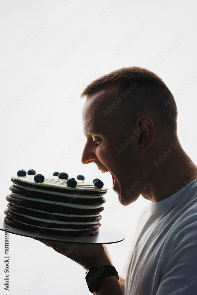 A man in a white T-shirt holds a large cake in his hands. The pastry chef holds a fresh cake in his hands.