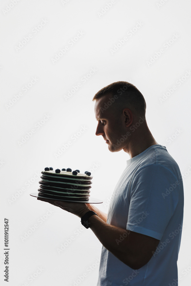 A man in a white T-shirt holds a large cake in his hands. The pastry chef holds a fresh cake in his hands.