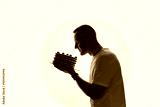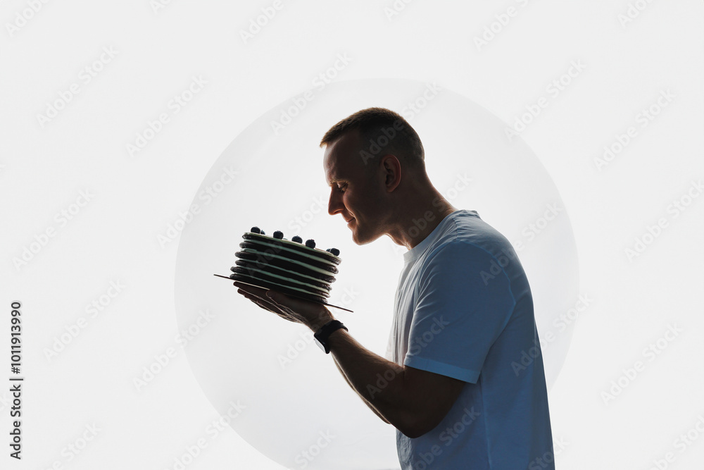 A man in a white T-shirt holds a large cake in his hands. The pastry chef holds a fresh cake in his hands.