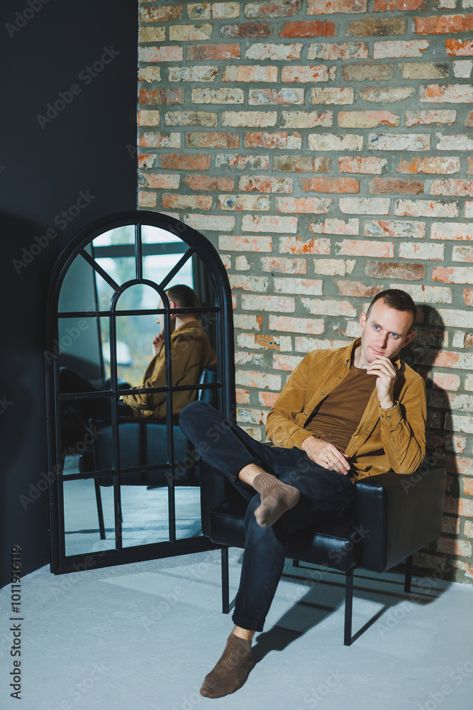 A handsome young man sits in a black chair and looks at the camera. A man on the background of a brick wall.
