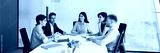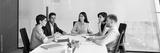 Group of multiethnic coworkers talking at large meeting table in modern office space, talking, discussing business communication, project, teamwork, sharing ideas for brainstorming. Banner shot