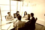 Young female Asian business leader holding meeting with diverse team of partners, colleagues sitting at large table in boss armchair, speaking. Multiethnic group of coworkers discussing teamwork