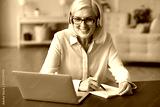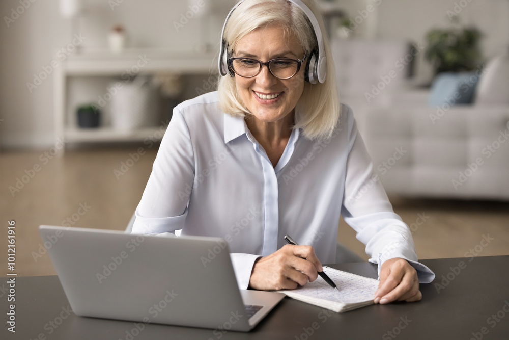 Aged woman wear headphones engaged in online study using laptop, participating in video call or virtual meeting, taking notes. Teacher lead on-line lesson, explain topic to learner. Tuition, education