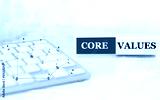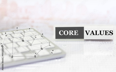 White label with keyboard on the table and text Core Values. concept with social media diagram