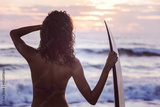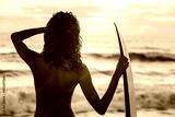 Woman Bikini Surfer & Surfboard Sunset Beach