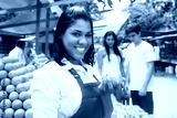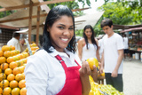 Lachende mexikanische Orangen Verkäuferin auf dem Wochenmarkt