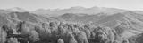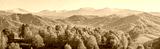 Panoramic fall view, mountain scenery, snow-capped peaks and forest, indian summer