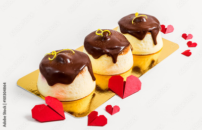 three cheesecakes topped with chocolate with red paper hearts on white background