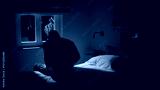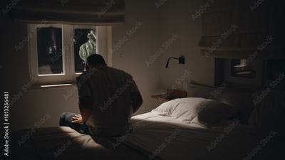 Troubled man sitting night bedroom home by window feeling melancholic back view