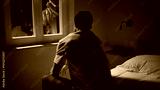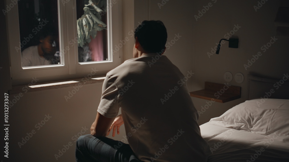 Sorrowful man sitting troubled at night bedroom reflected in dark window closeup