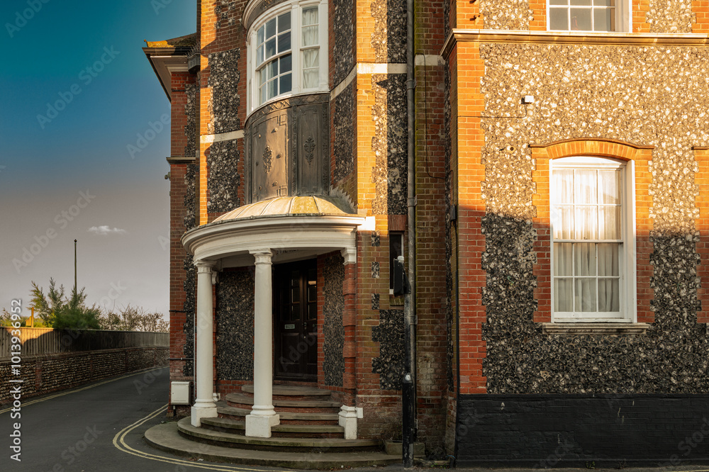 Flint laden large historic house showing the ornate and covered porch. Located in the famous seaside town of Aldeburgh, UK.
