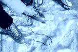 Young woman ice skating outdoors on a pond on a freezing winter day - detail of the legs.