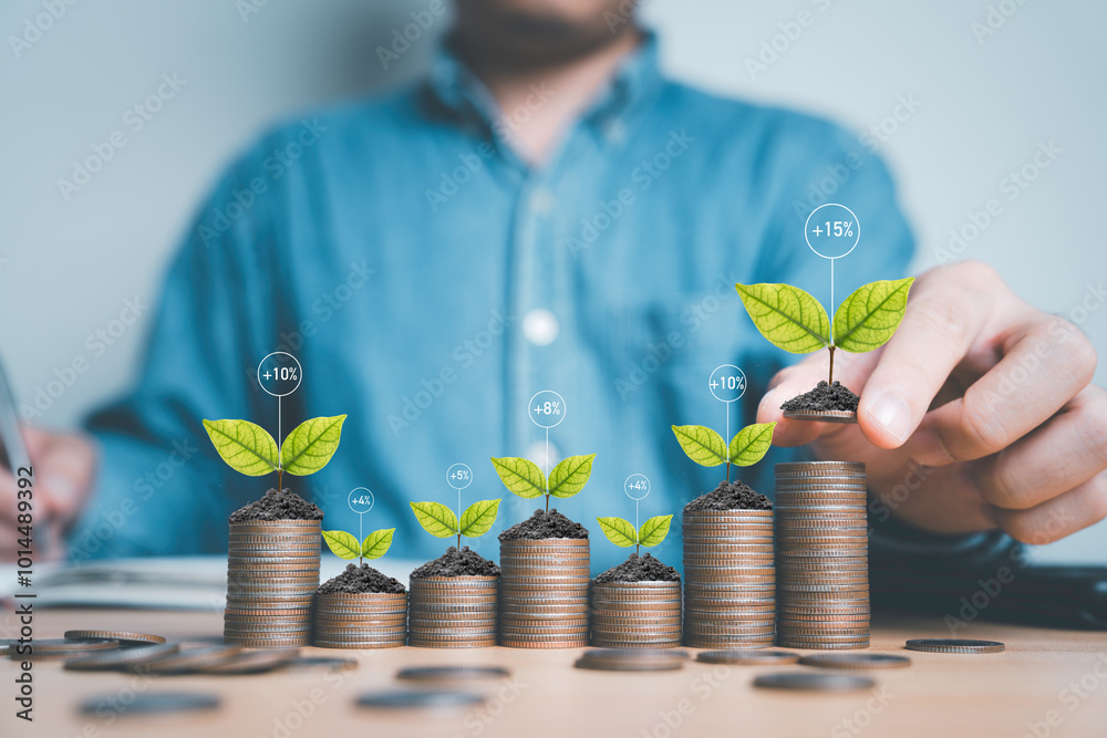 Businessman putting coin with growing tree on coins stacking for deposit saving to investment and get dividend yield growth concept.