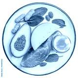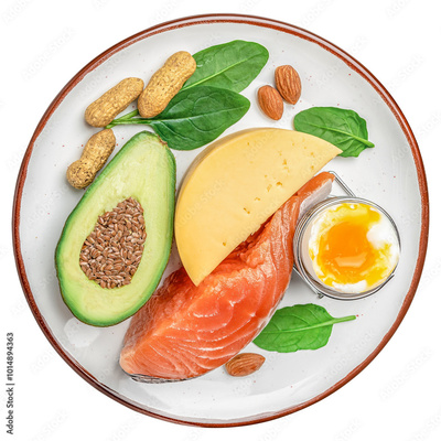 Ketogenic diet. Buddha bowl dish with Salmon fish steak egg, avocado, fresh salad and nuts isolated on white. Detox concept