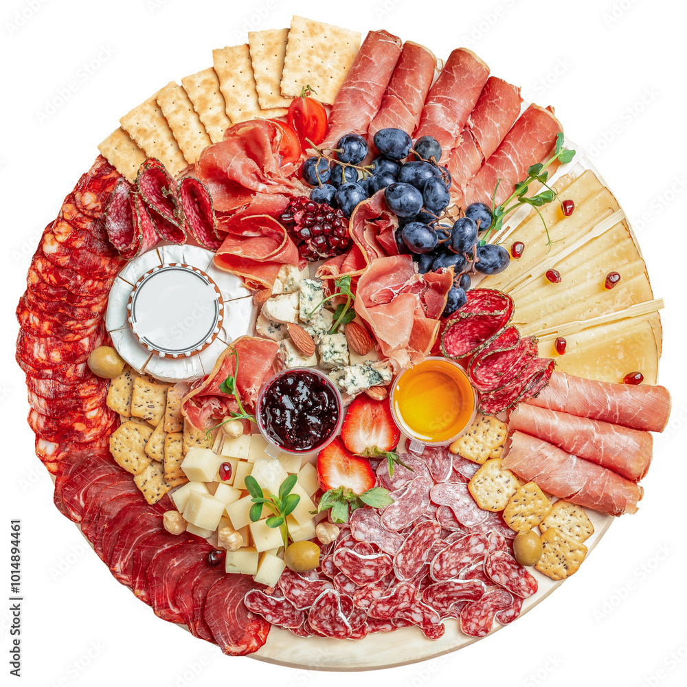 Appetizers with different snacks, Antipasto board with sliced meat, ham, salami, cheese isolated on white background. top view
