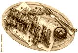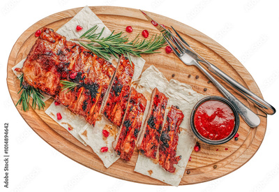 grilled pork ribs with sauce on a wooden board isolated on white background. top view clipping path. top view