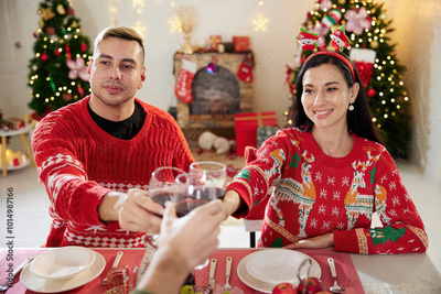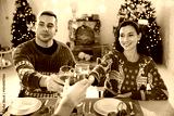 Happy couple have a dinner and drinking red wine with friends on Christmas day
