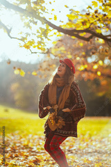 smiling young woman in red hat throwing autumn leafs