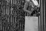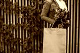 Closeup on young female in orange trench coat with shopping bag