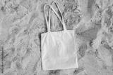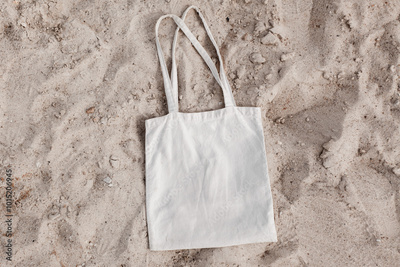 White cotton or mesh bag on beach sand background. Zero waste, no plastic, eco friendly shopping, recycling concept. Blank mockup shopper with place for artwork or text. Flat lay, copy space